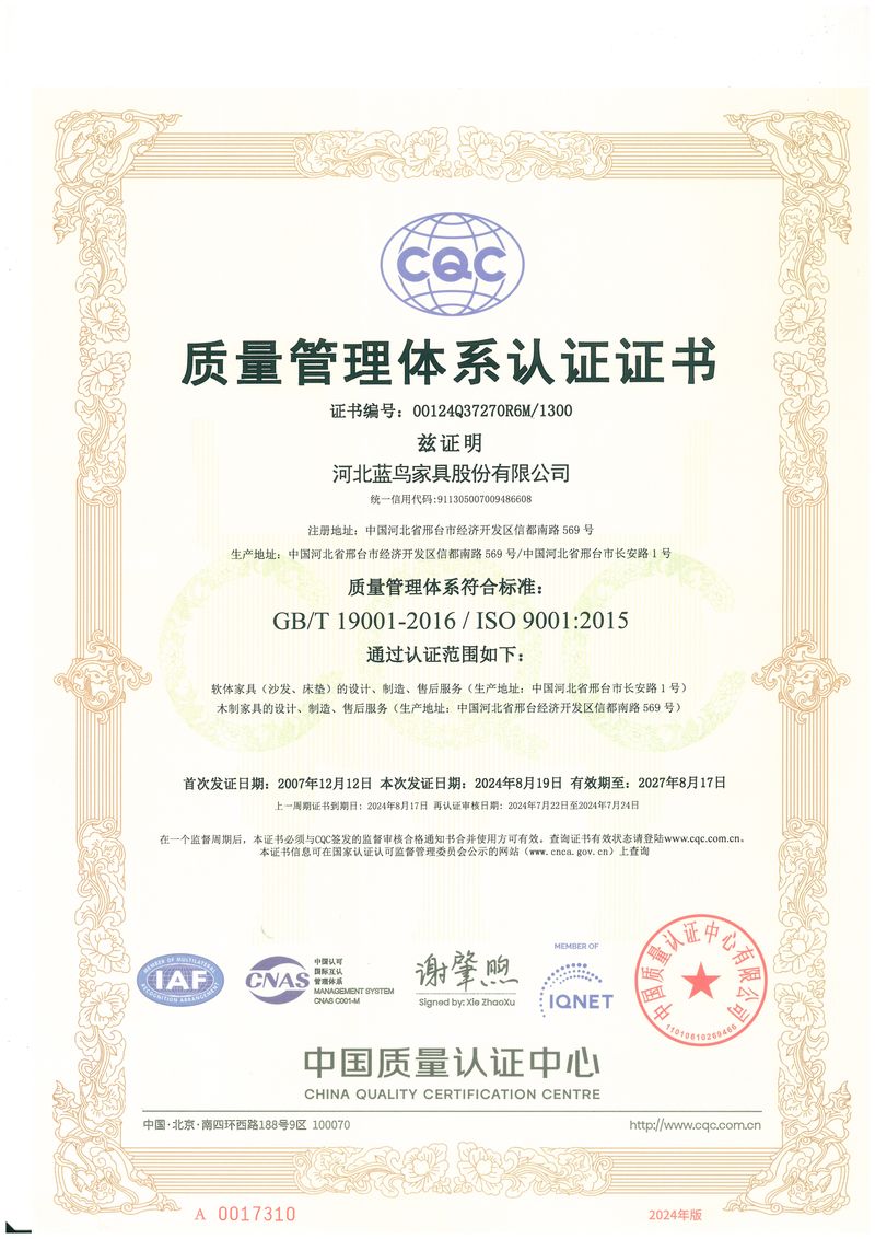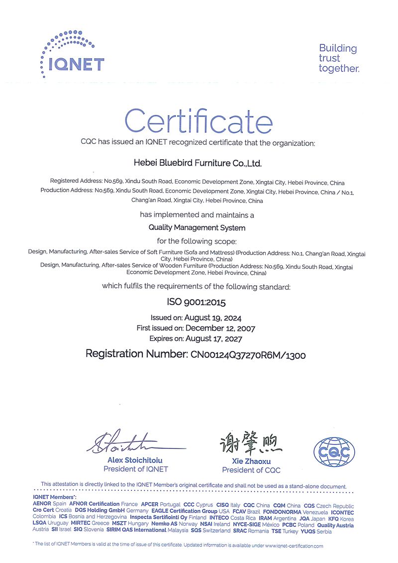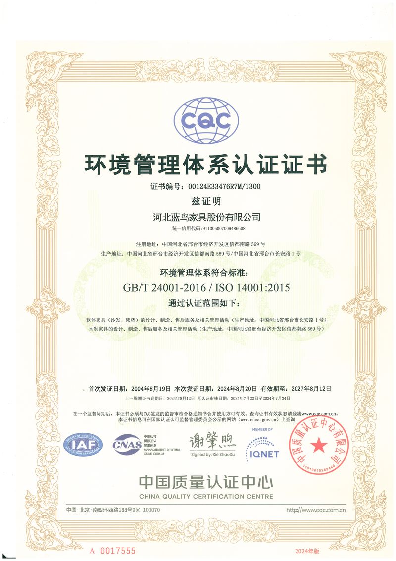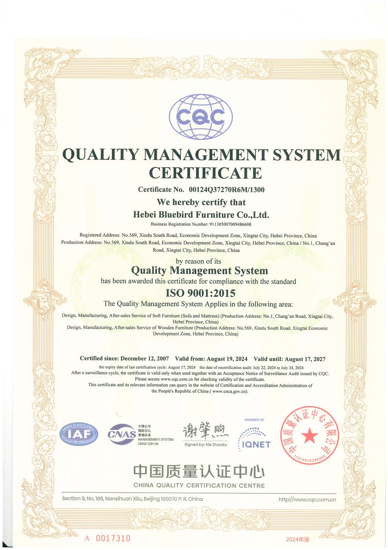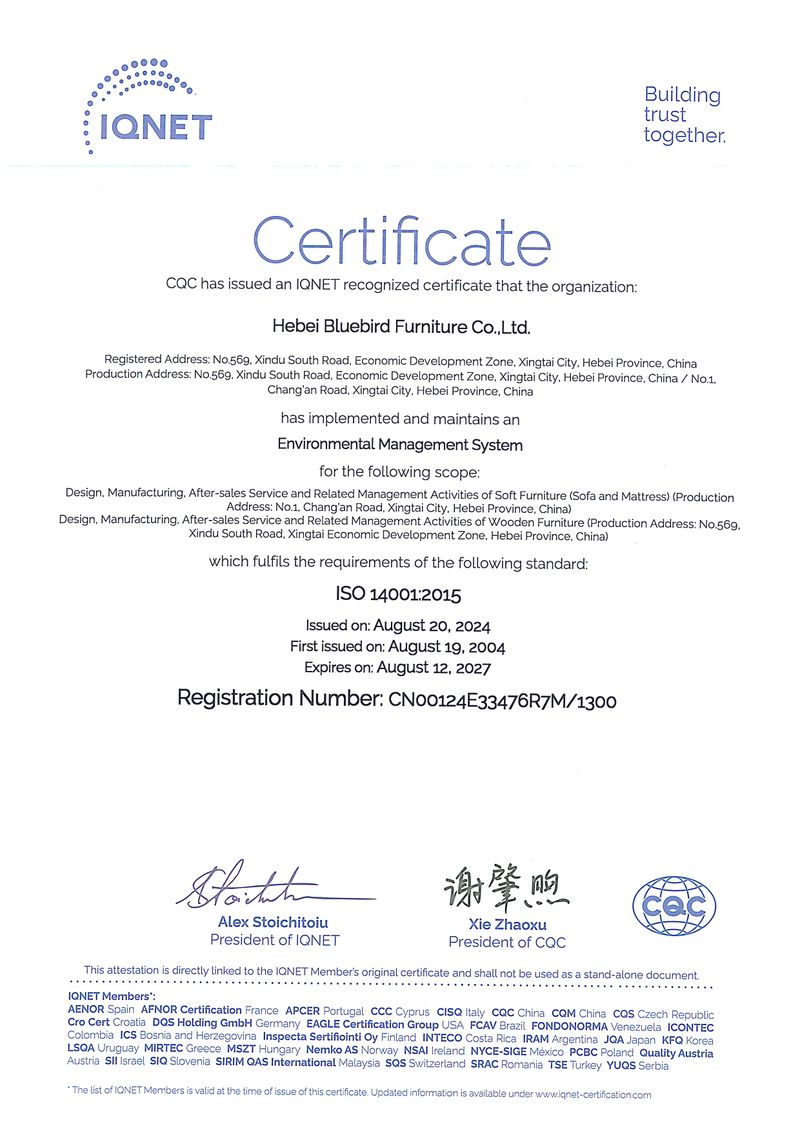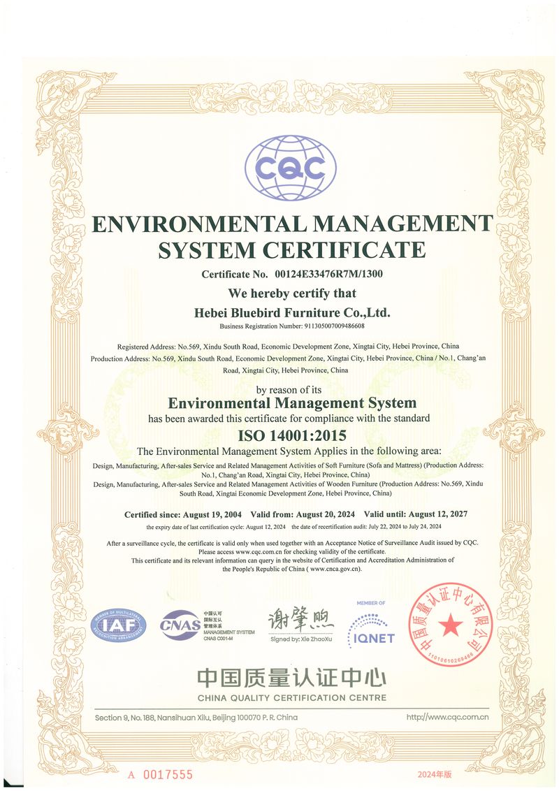 Our operations are managed under ERP and 5S systems, and we strictly follow international quality and environmental standards. Bluebird Furniture is certified with ISO 9001, ISO 14001, and CEC Certification, reflecting our commitment to quality control and sustainable manufacturing.